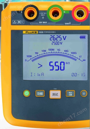 美国福禄克F1535绝缘电阻测试仪/兆欧表特点:1.绝缘电阻量程高达500GΩ;2.快速测量设计,绝缘阻值更快达到稳定读数;3.具备自动计算的极化指数(PI)/介电吸收比(DAR)功能;4.低功耗设计满足高强度工作需求:2500V测量次数高达1300次*;5.具备高安全性设计,符合CAT IV 600V标准及电力行业规范DLT845